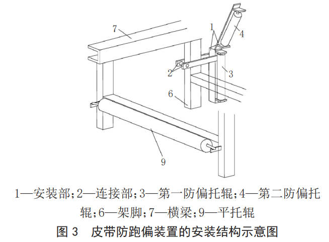 皮带防跑偏装置安装如下页图3所示。皮带机皮带防跑偏装置中,固定架的连接部用于将固定架的安装部固定于皮带机的H架上,而第一防偏托辊和第二防偏托辊均固定于安装部上,第一防偏托辊可用于限制下皮带的偏移,以防止下皮带跑偏,第二防偏托辊可用于限制上皮带的偏移,以防止上皮带跑偏。